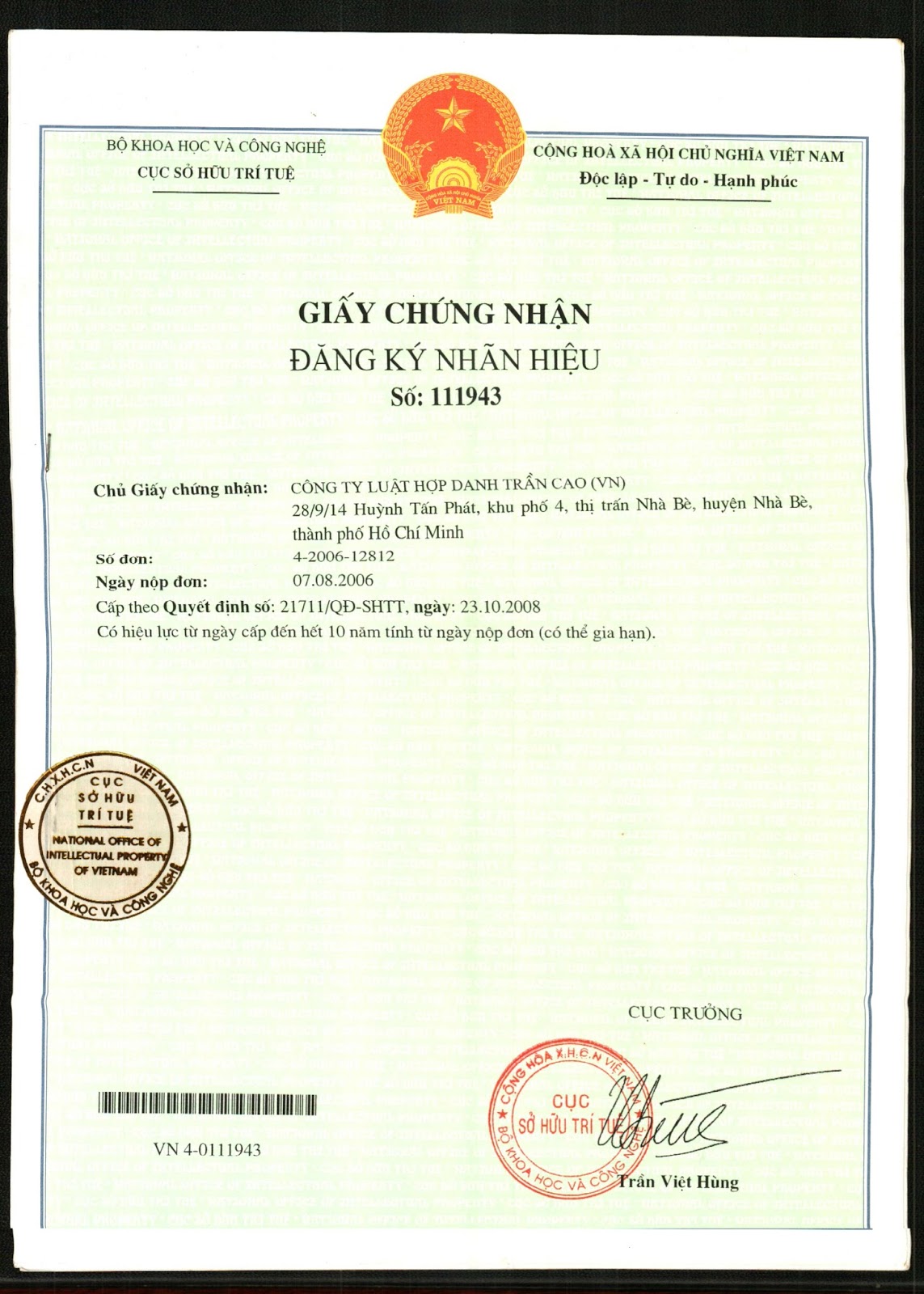 ĐĂNG KÝ BẢO HỘ QUYỀN SỞ HỮU TRÍ TUỆ CỦA CÔNG TY LUẬT HỢP DANH TRẦN CAO